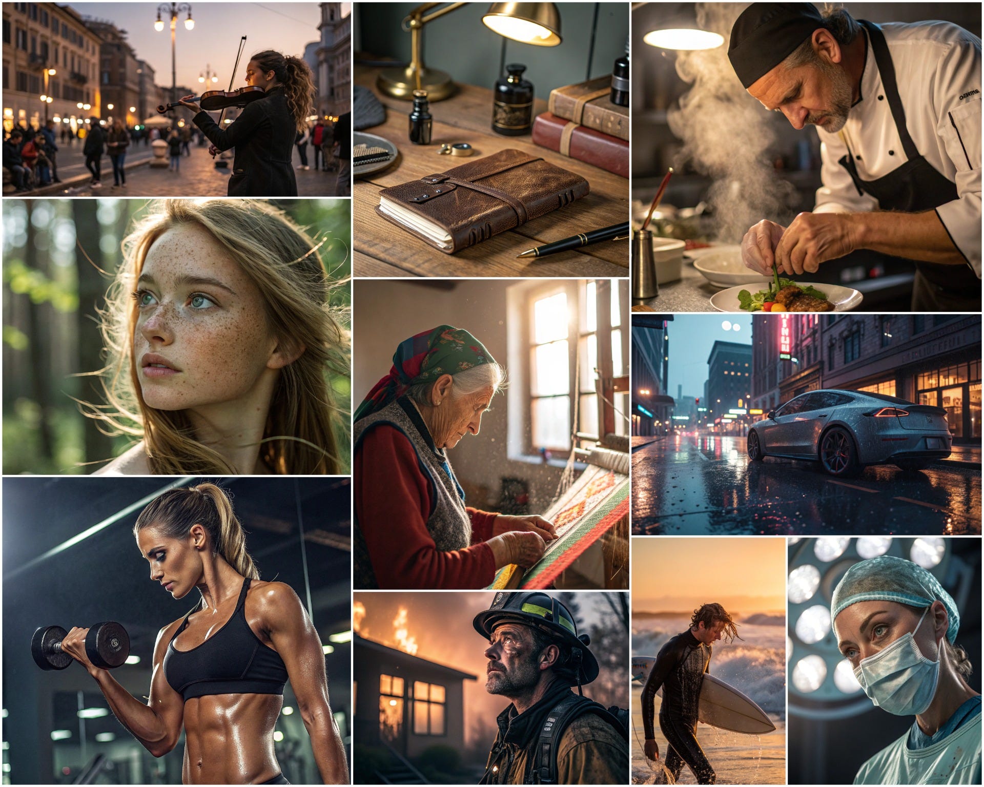 Recraft V3 excels at generating hyper-realistic human images, capturing intricate details like skin textures, facial expressions, and natural lighting with remarkable anatomical accuracy, making it ideal for a stunning collage of human portraits. Its advanced rendering capabilities produce lifelike visuals with precise proportions and realistic environments, ensuring each human figure appears authentic and engaging. With fast generation and precise style control, Recraft V3 empowers designers to craft professional-grade, hyper-realistic human imagery that elevates branding, storytelling, and artistic projects.
