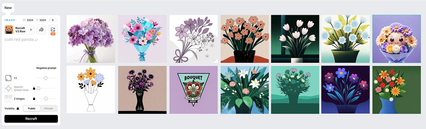 I can view all the designs on a canvas, which is crucial for my creative and design process. With the vast selection of models and styles available on Recraft, it's easy to find the look I want. Check out one of the examples here: with a simple prompt, “a bouquet of flowers,” I selected the styles I liked, generated the results, and was able to view them all to choose the design that suited me best.