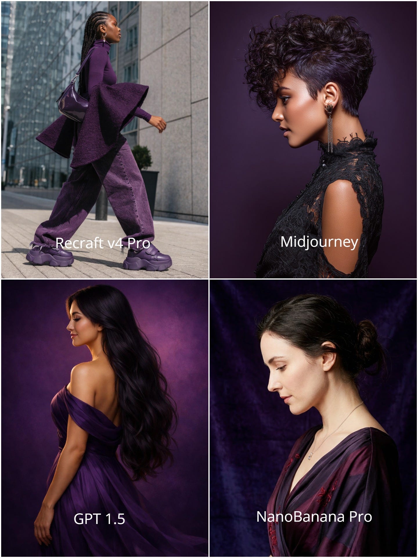 I tried it with a super simple prompt: “a lady, side view, overall dark purple vibe.” Ran the same prompt through a few image models and did a quick comparison. You can really tell this one understands design and actually has taste. Try it free at Recraft.