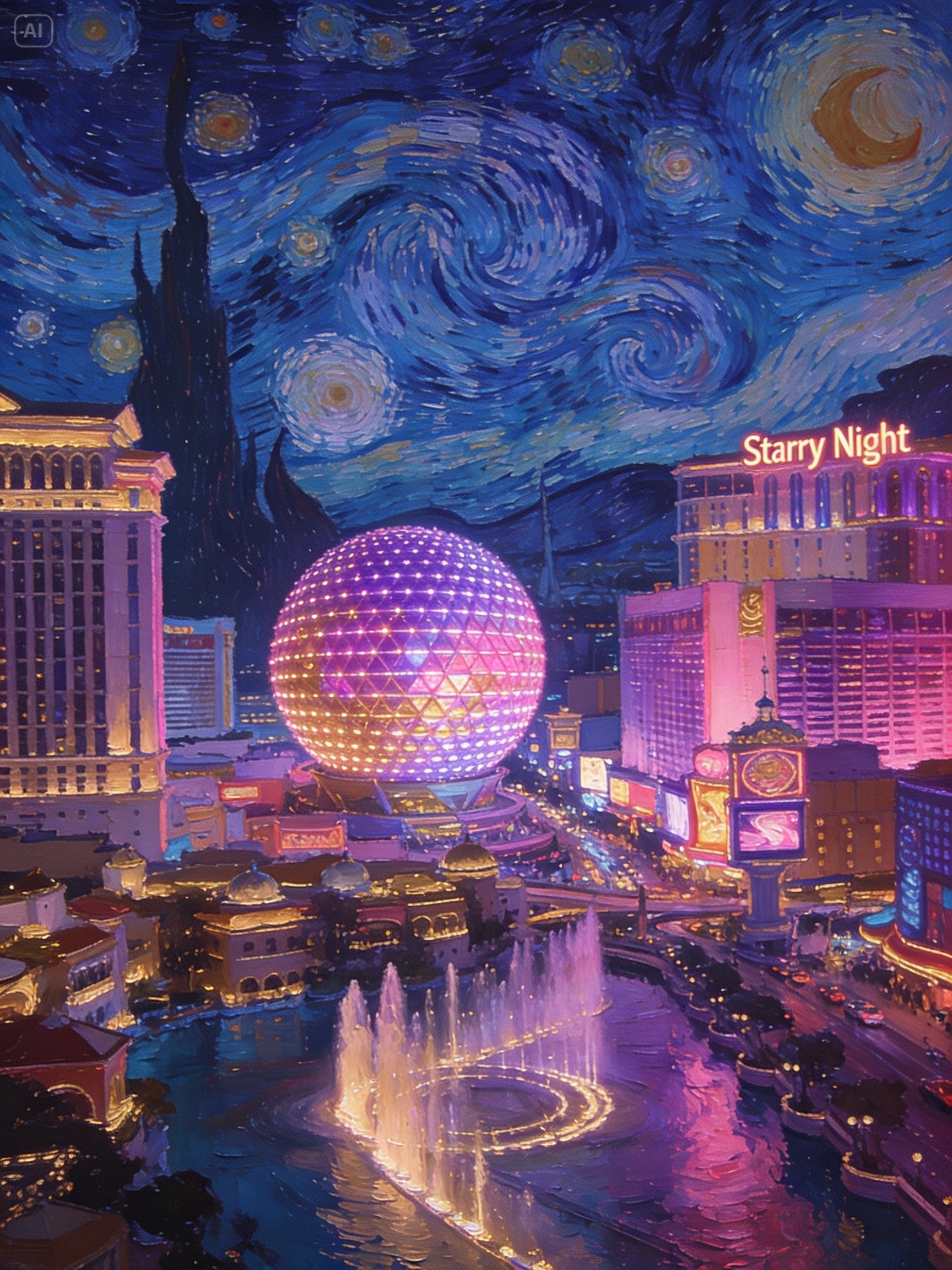 Prompt: Imagine if Vincent van Gogh painted the modern-day Las Vegas Strip, include the Sphere and the Bellagio fountains. Apply the 'Starry Night' impasto technique, but ensure the neon lights of the buildings are the primary light sources in the scene.